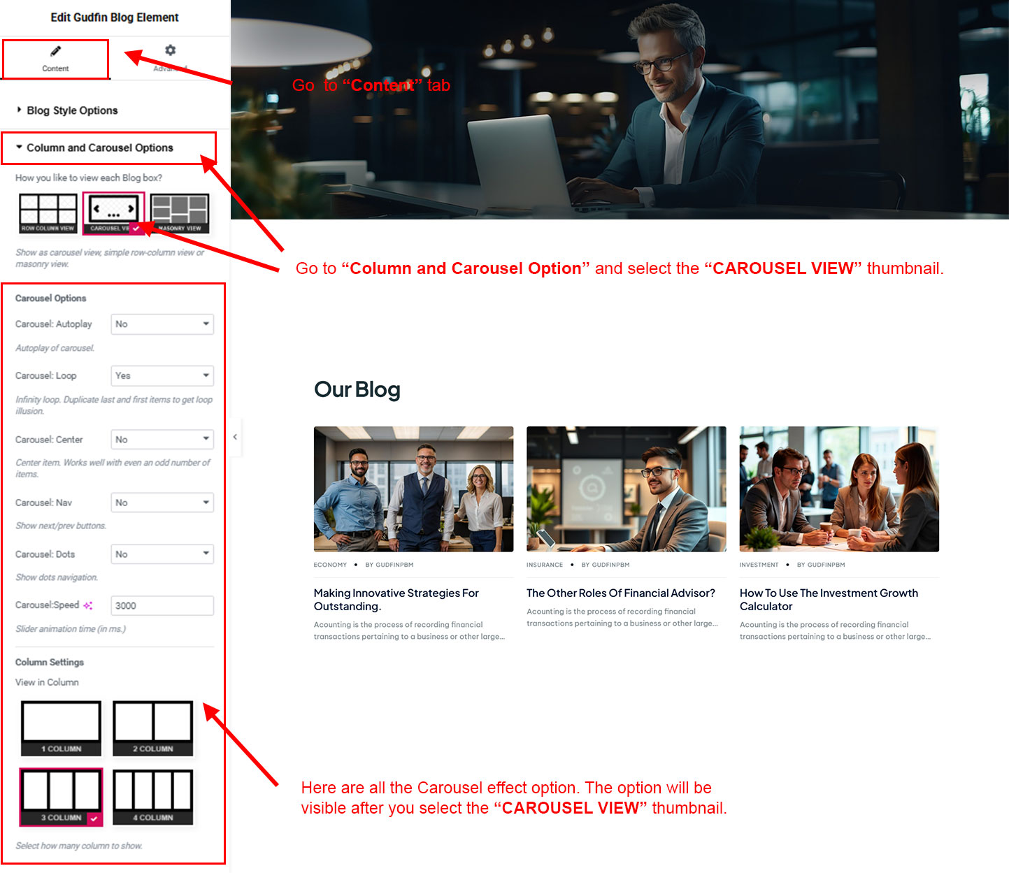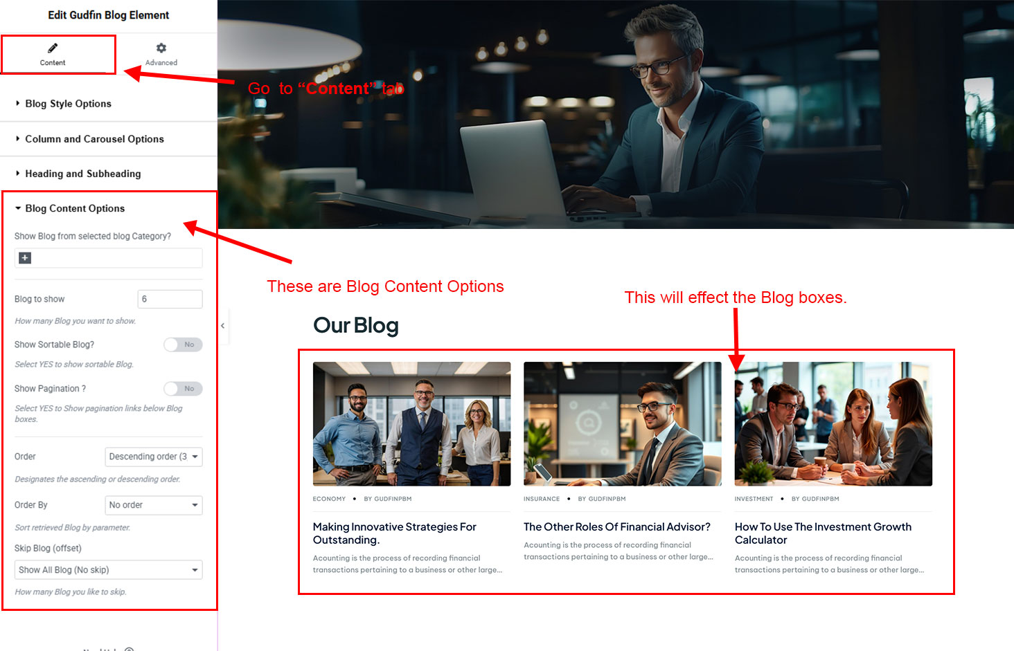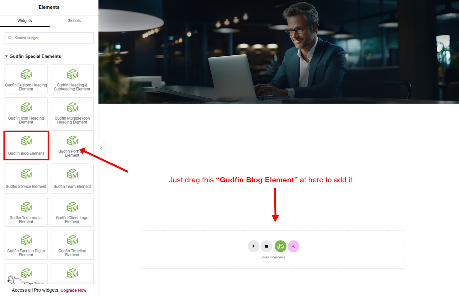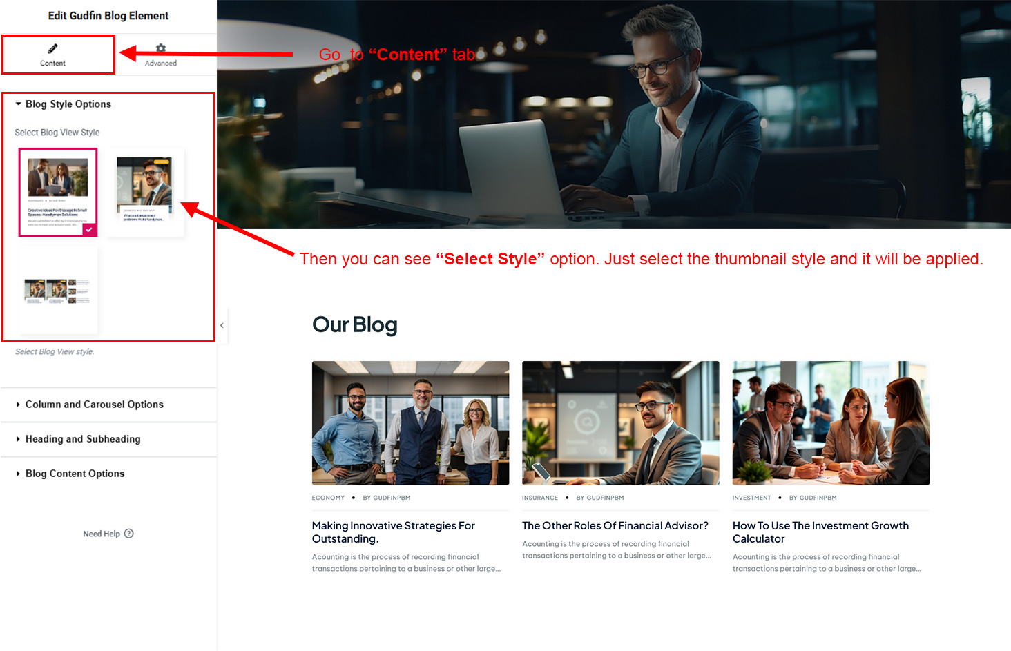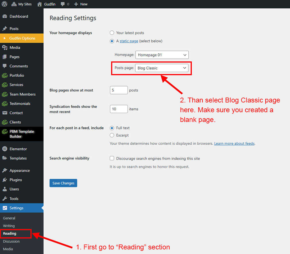 We created a Blog Element in Elementor Page Builder which you can use to show post on any page you want. Just drag and drop the Gudfin Blog Element on any page and the post list will appear.