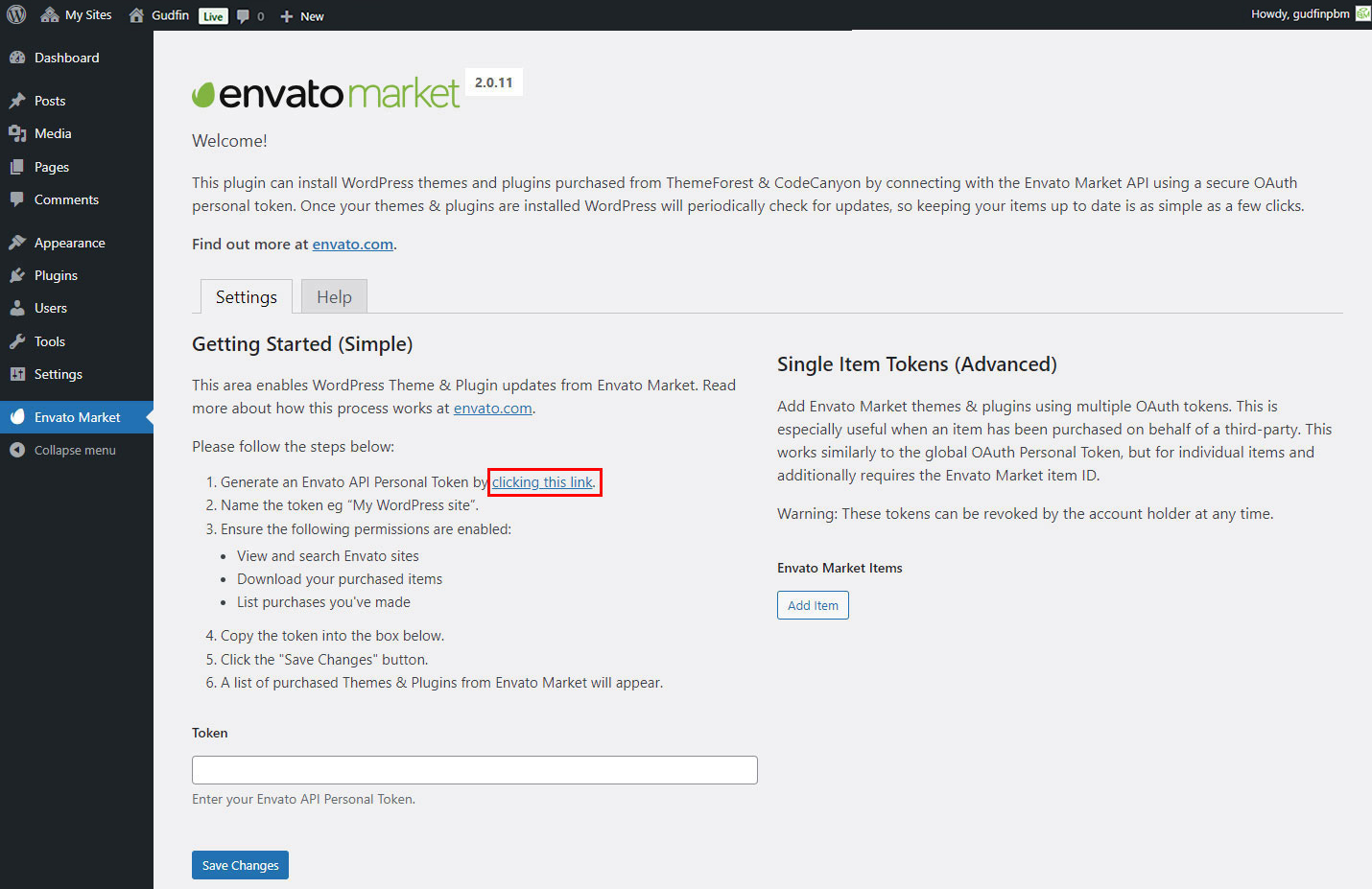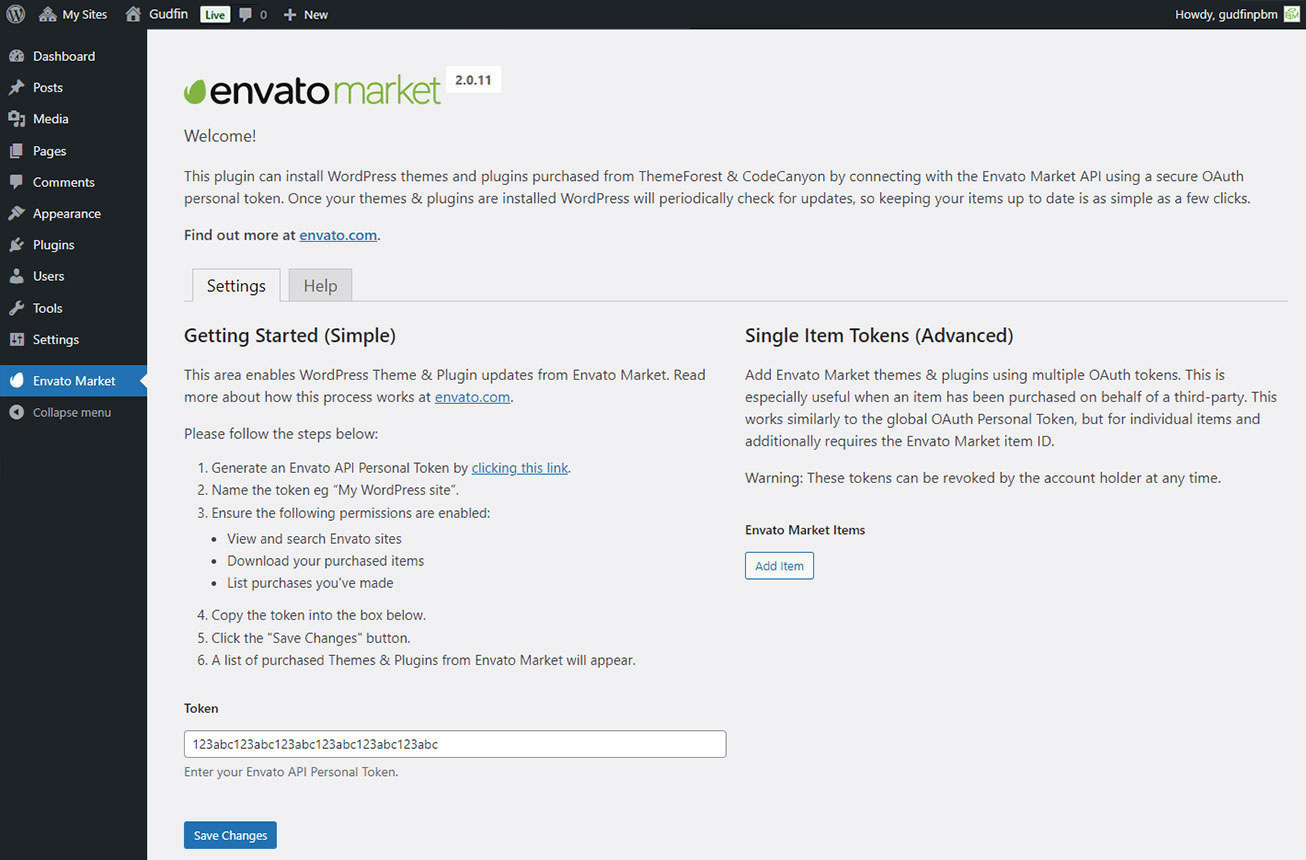 Now go back to your WordPress installation and paste in your Envato API token then click save.