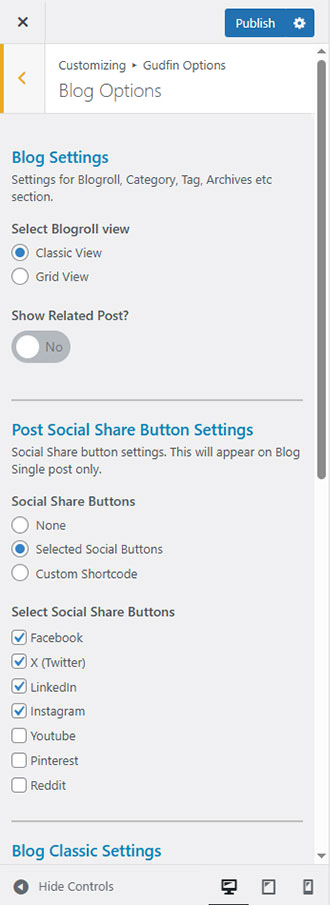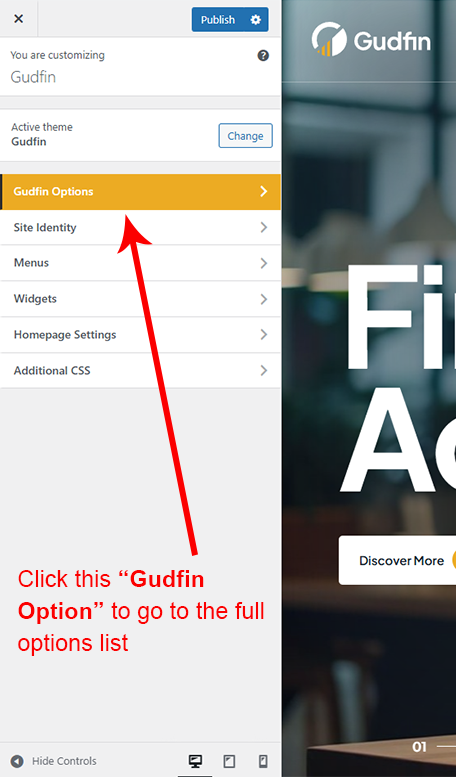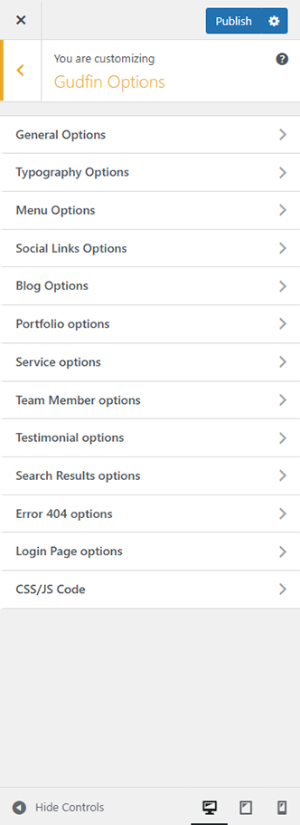 Gudfin Options (Theme Options) panel is created with WordPress' Customize section. We added our own options with WordPress' default options.