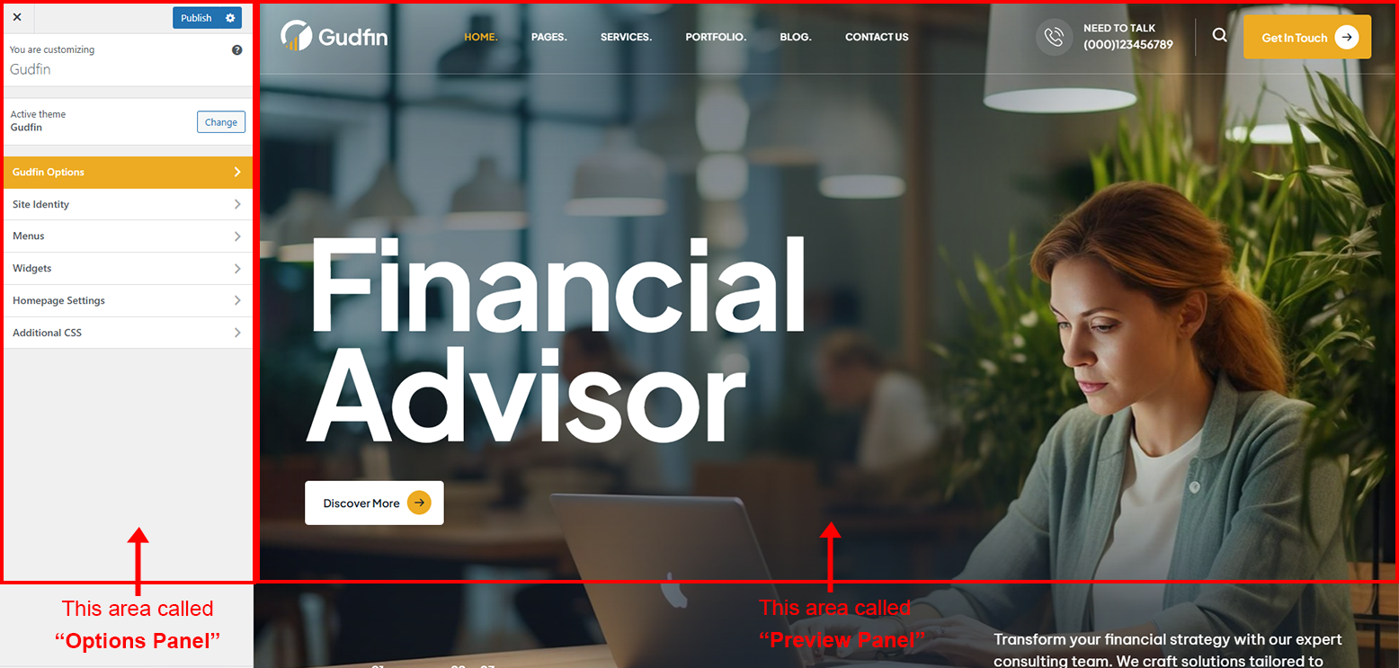 After clicking on the Gudfin Options panel you will redirected to the Customize section. It has two sections. Left area called "Options Panel" and the right area called "Preview panel". See screenshot given below: