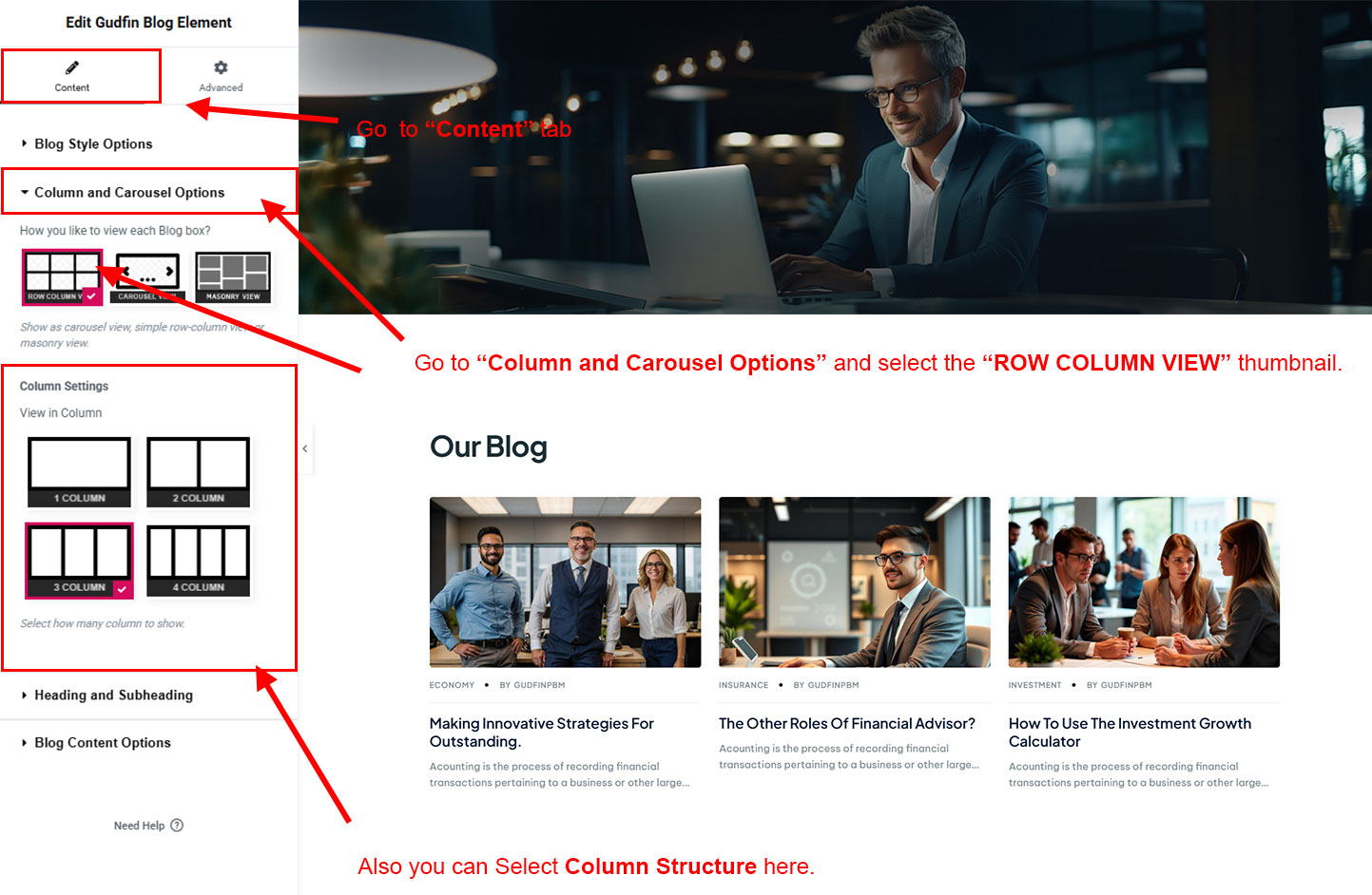 But you can change the view easily. Just go to Gudfin Options >> Blog Options and you will find all options to modify the view. You can convert it to block view, column view, limit the blog intro text etc.