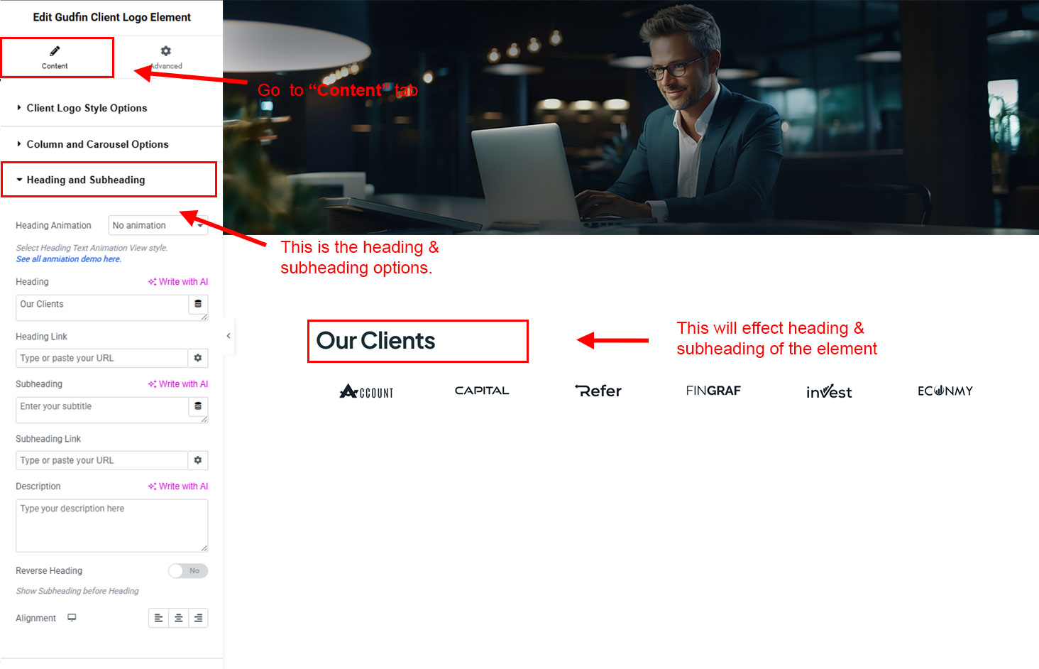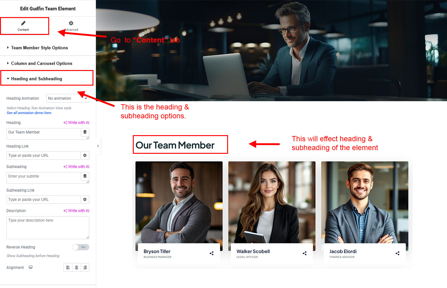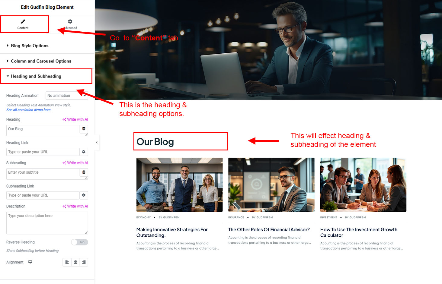The heading and subheading will appear at top of the element. You can change text, add link to the heading or subheading, change alignment, change tag (for SEO purpose) etc.