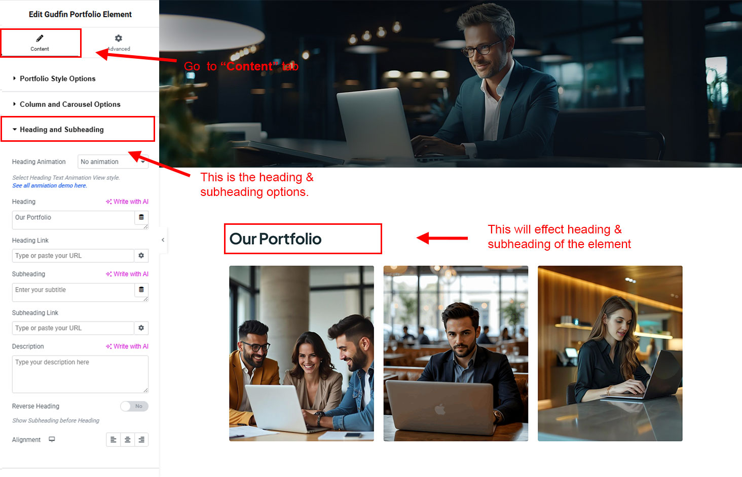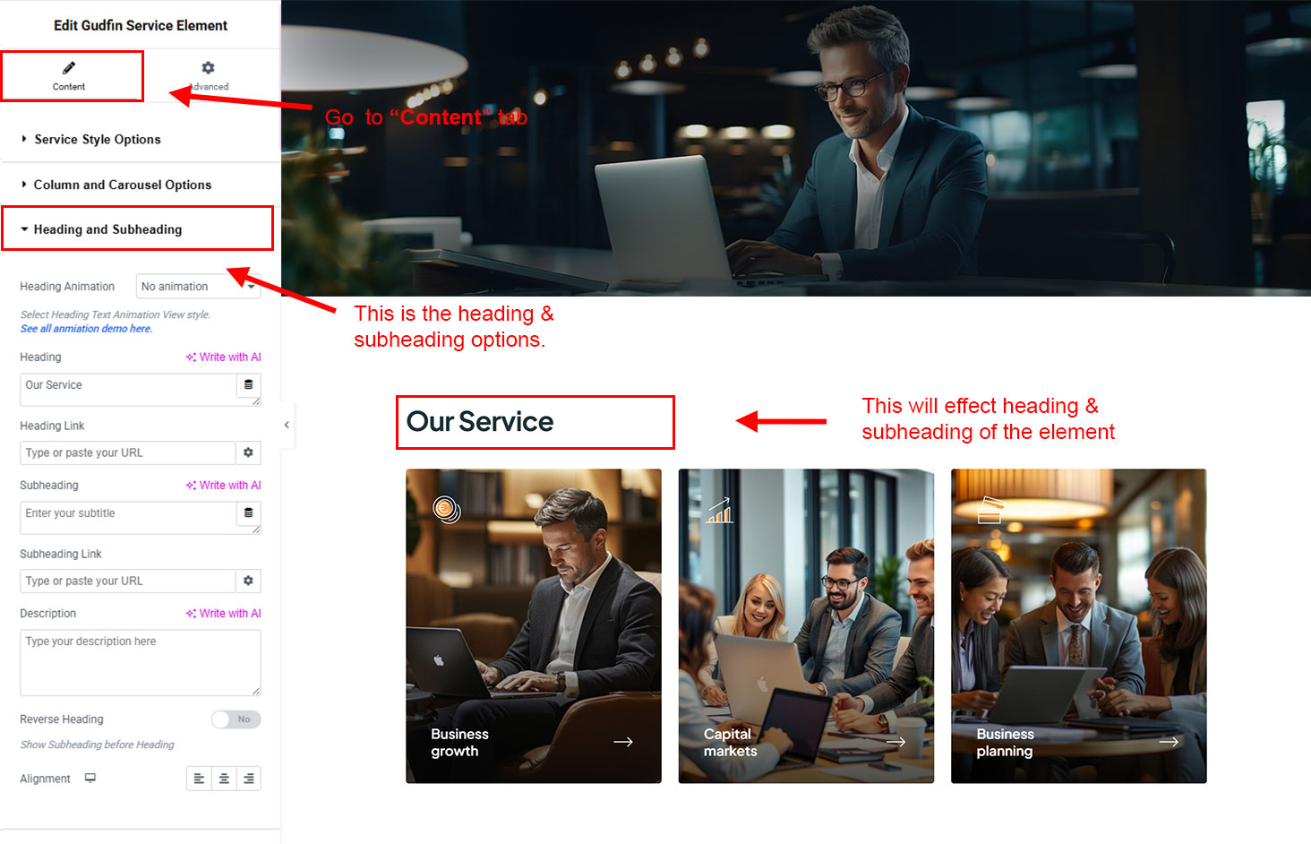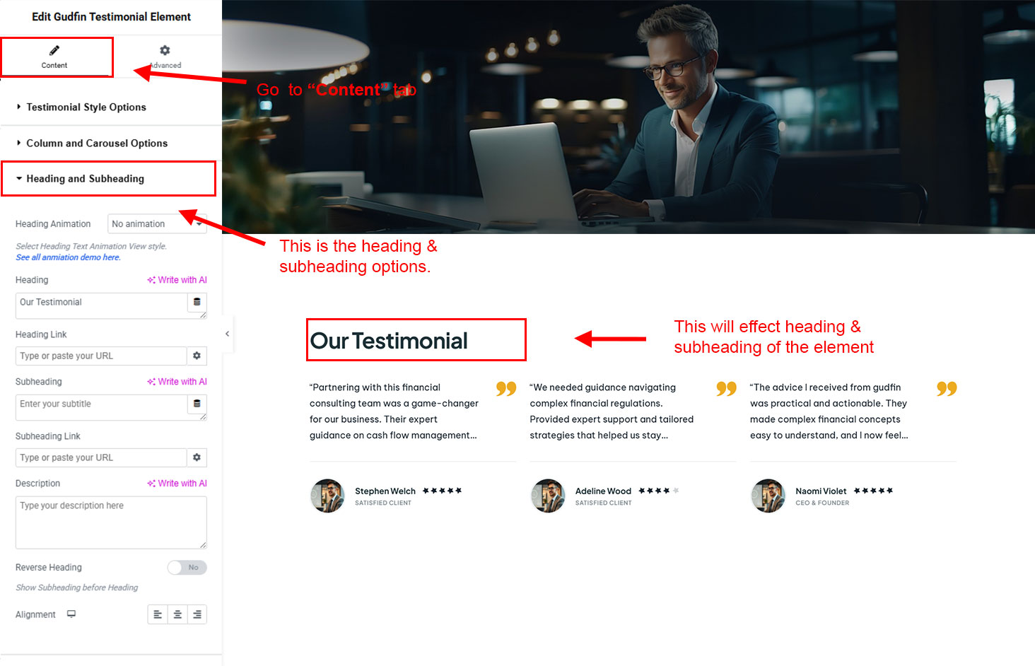 The heading and subheading will appear at top of the element. You can change text, add link to the heading or subheading, change alignment, change tag (for SEO purpose) etc.