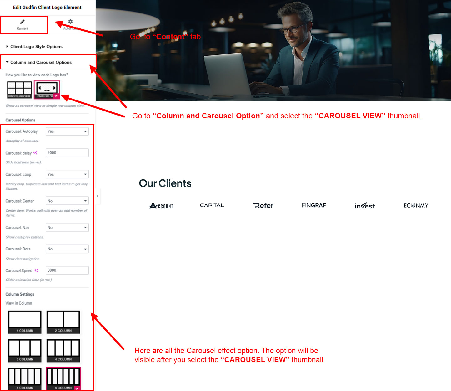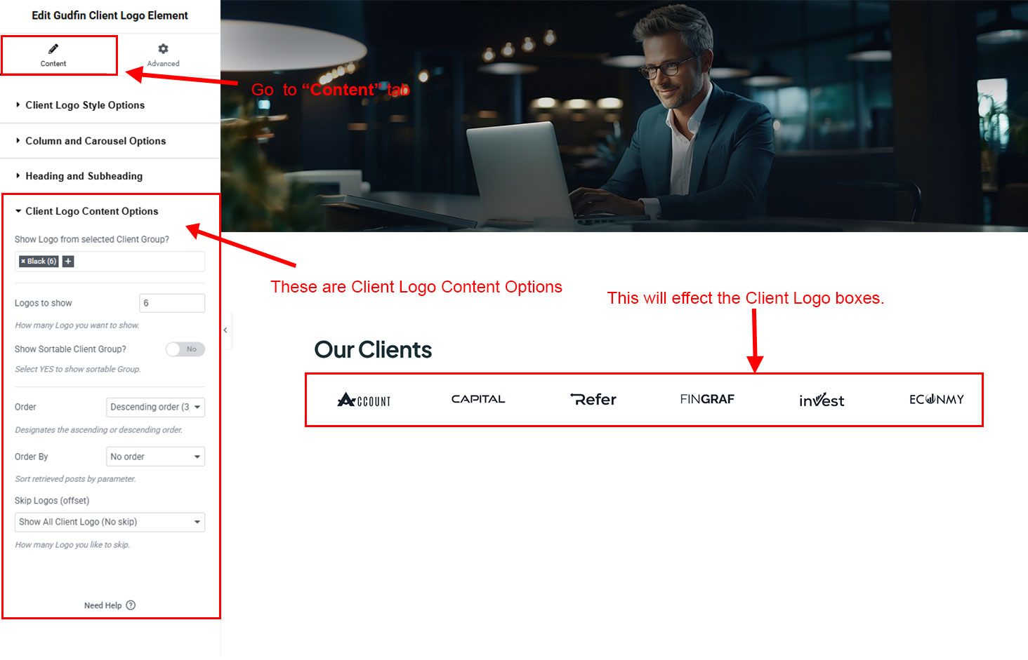 You can select the client-logo options here. Like how many client-logo you like to show, show client-logo from selected group (category), client-logo order etc.