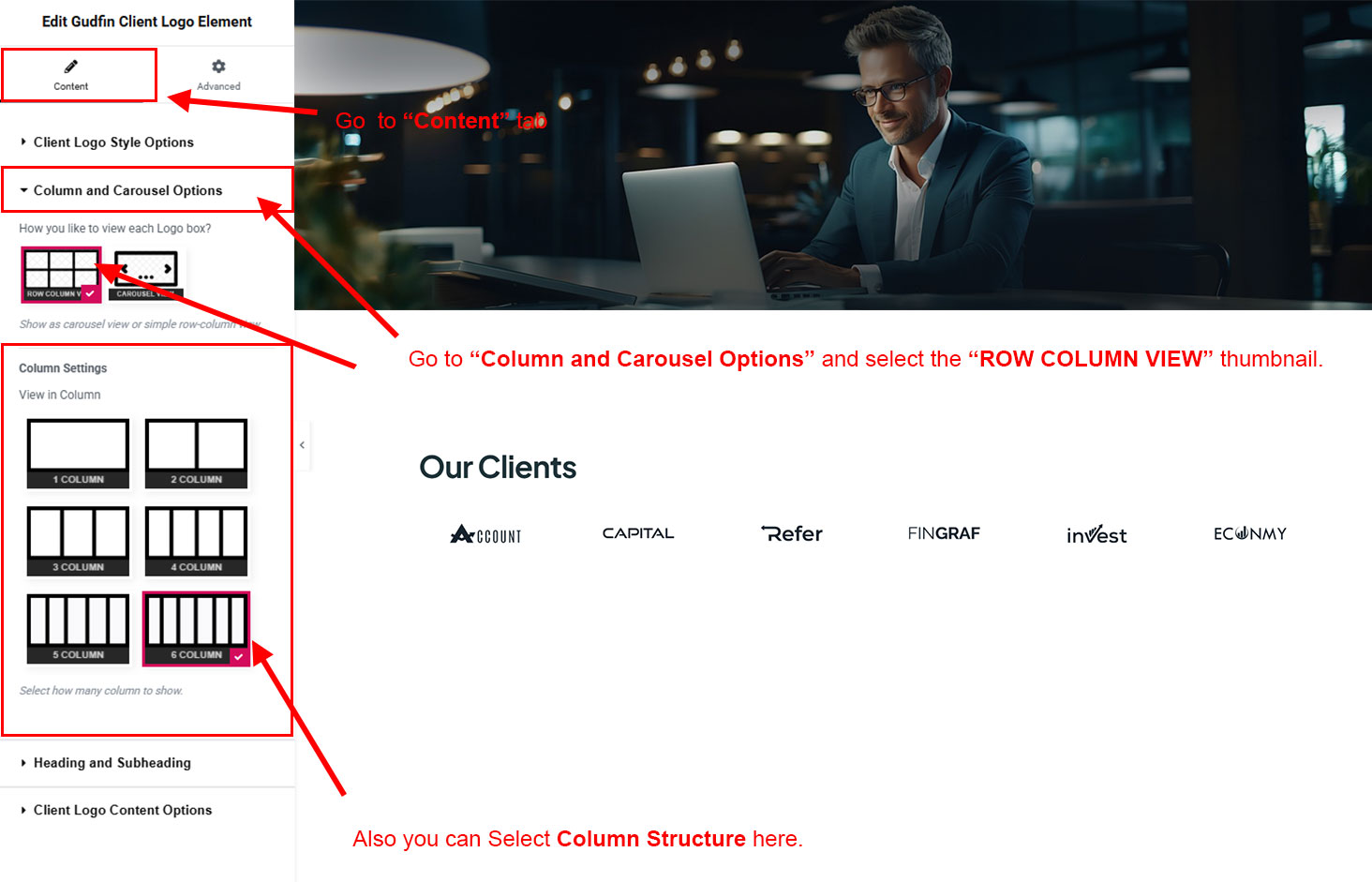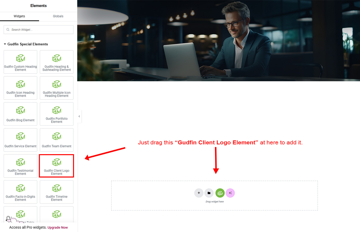 Now we have some Client Logo posts. So we can show all Client Logo on a page. Create a new page and add Gudfin Client Logo Element on a page by dragging it.