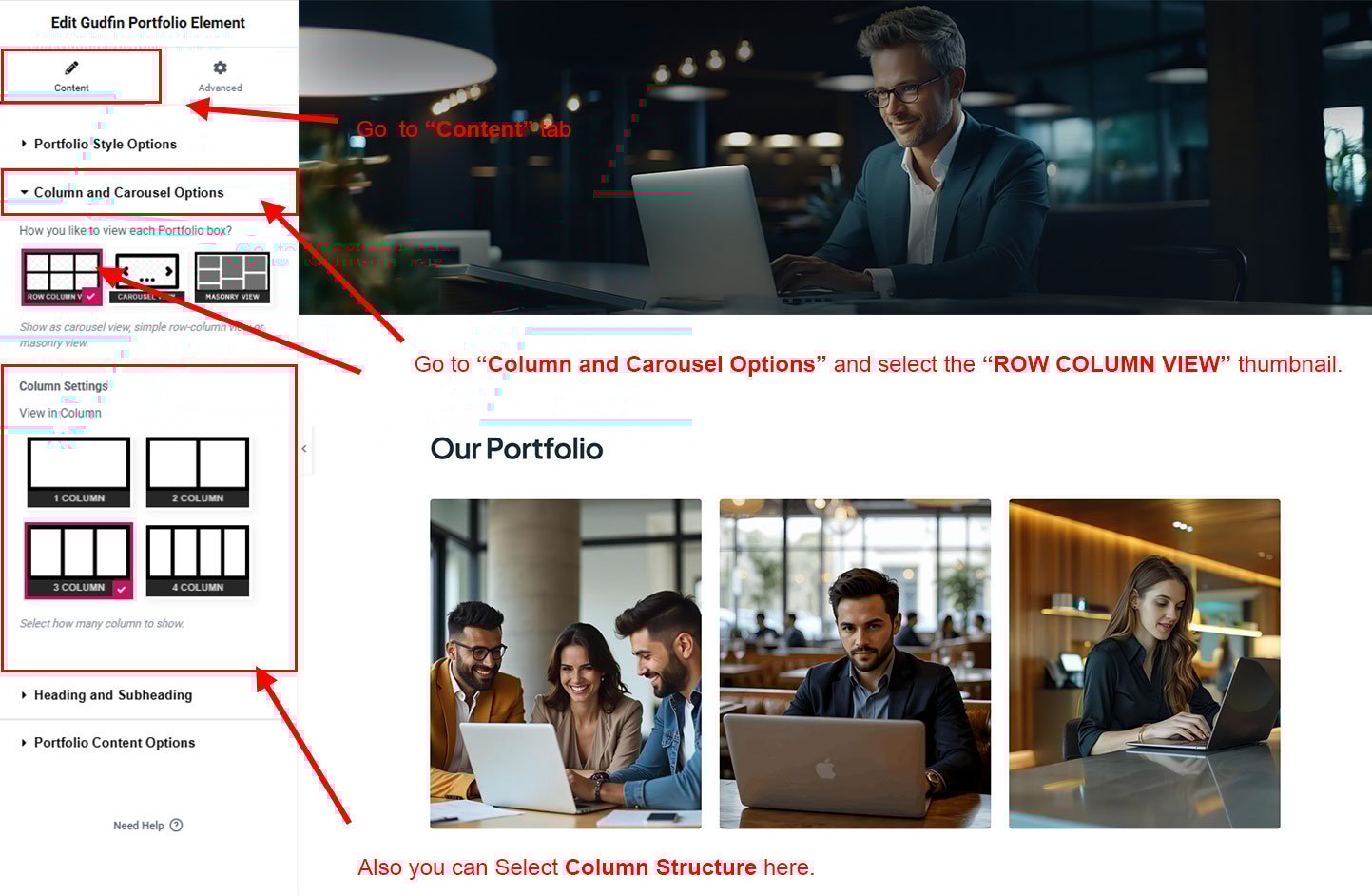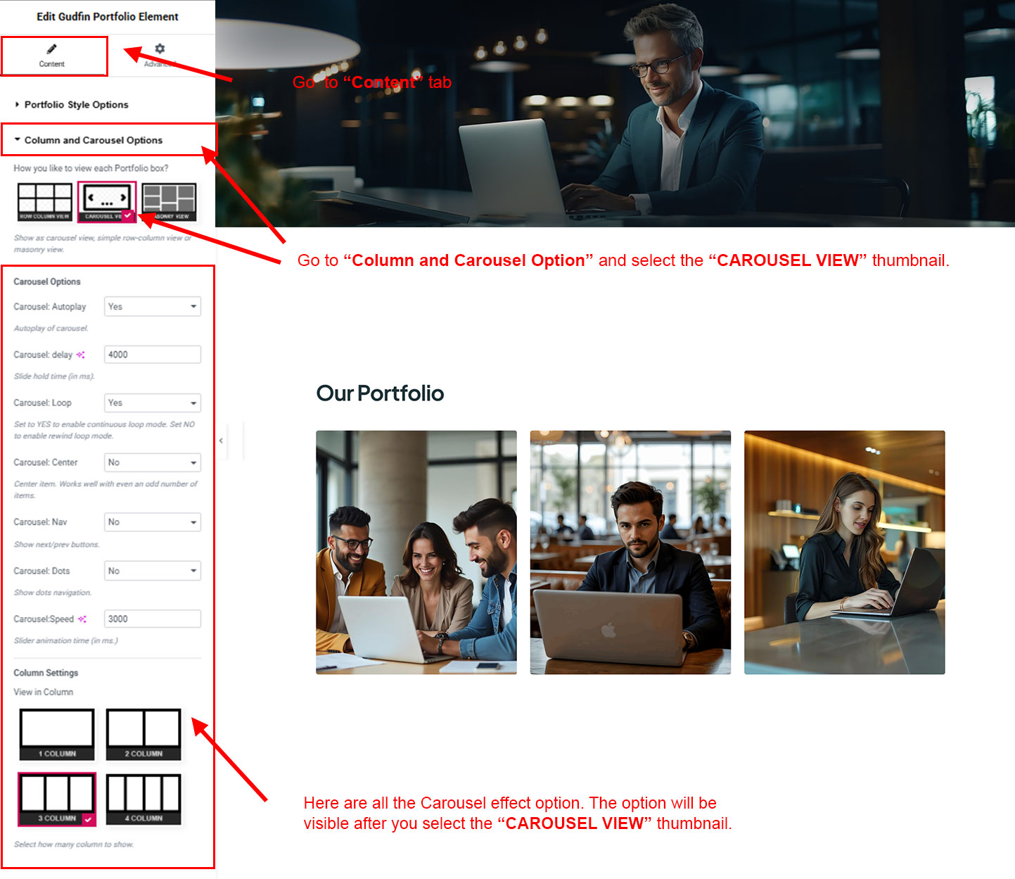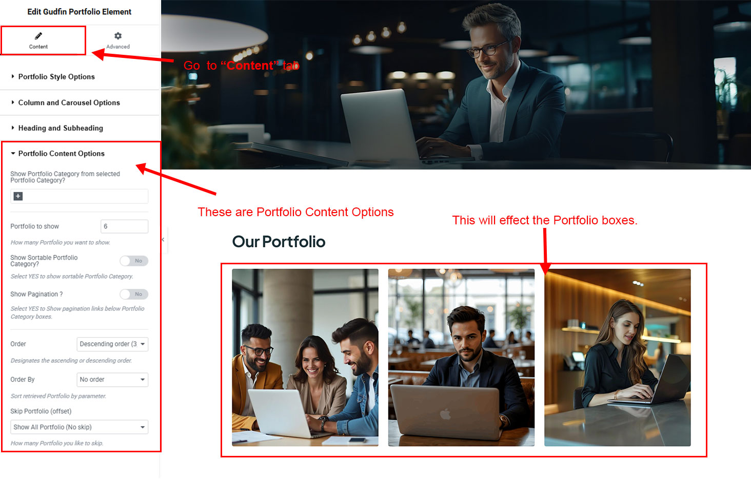 You can select the portfolio options here. Like how many portfolio you like to show, show portfolio from selected category, portfolio order etc.