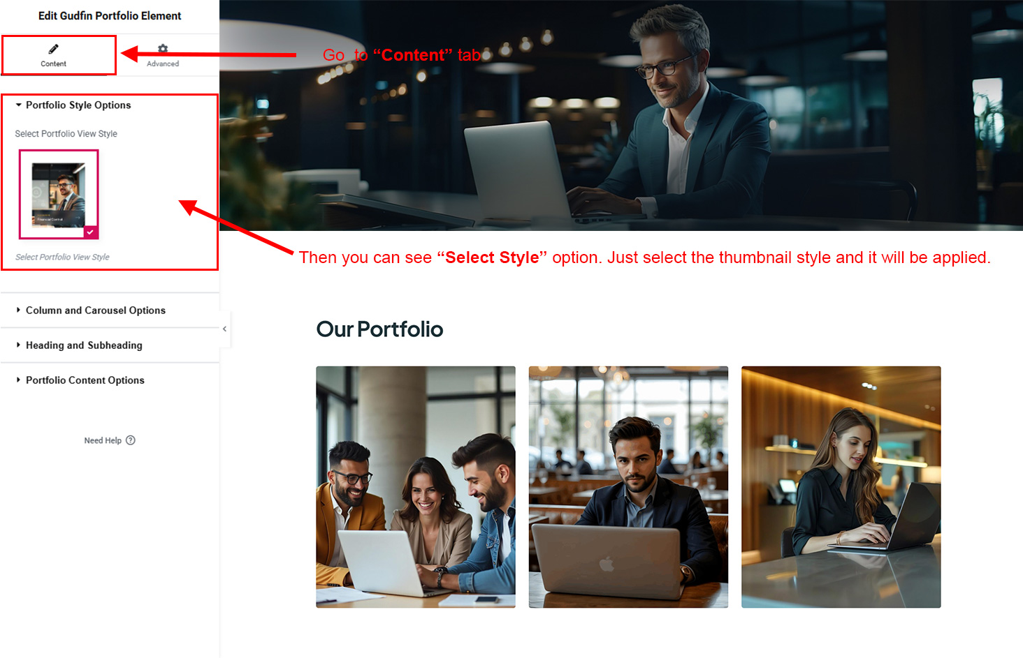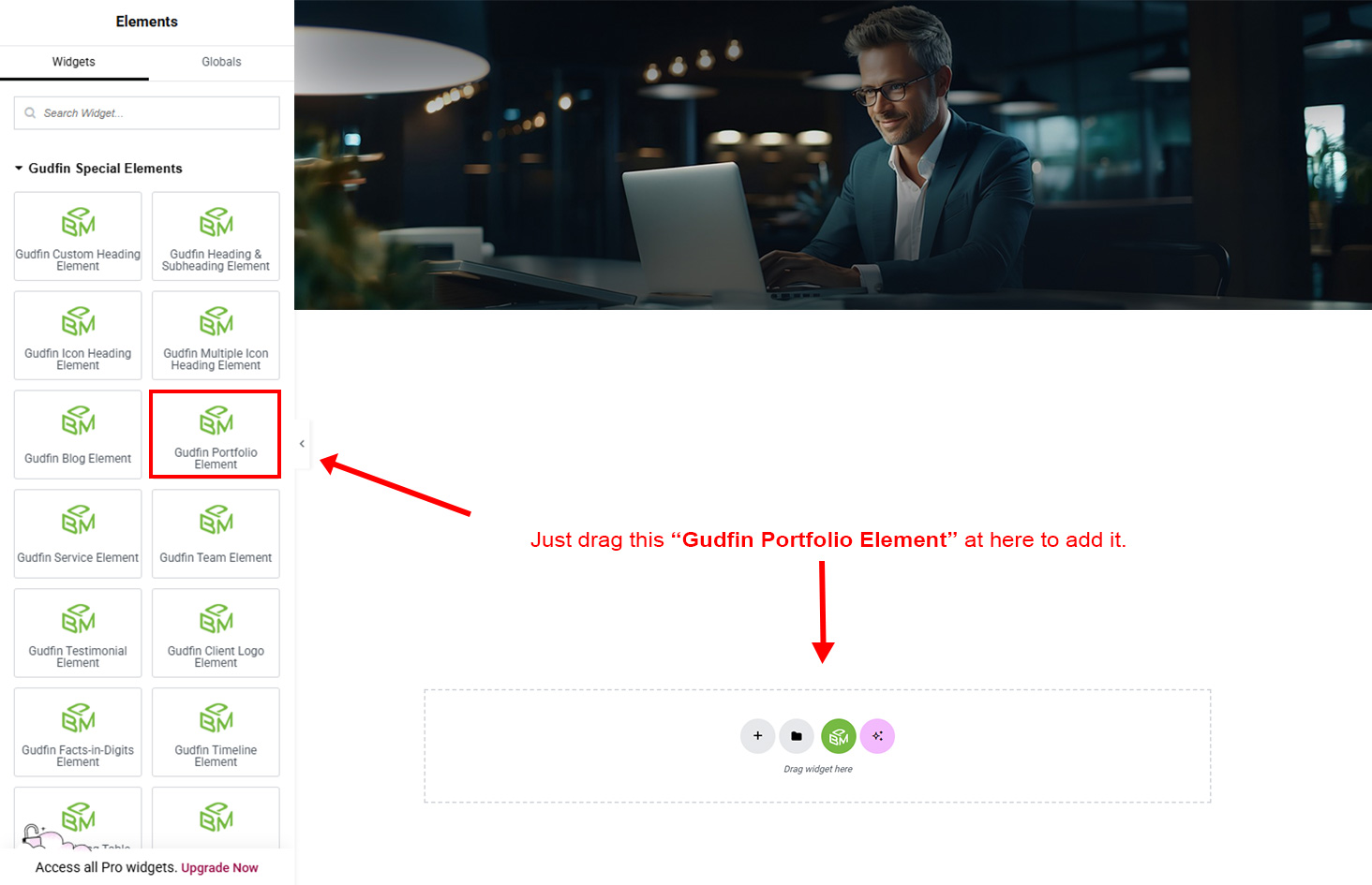 Now we have some Portfolio posts. So we can show all Portfolio on a page. Create a new page and add Gudfin Portfolio Element on a page by dragging it.