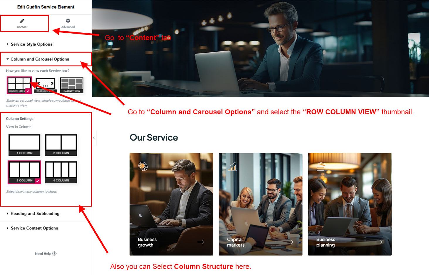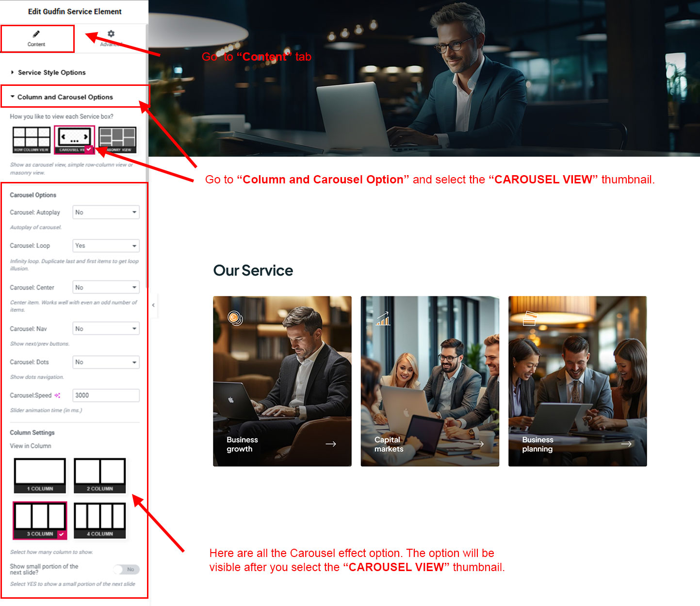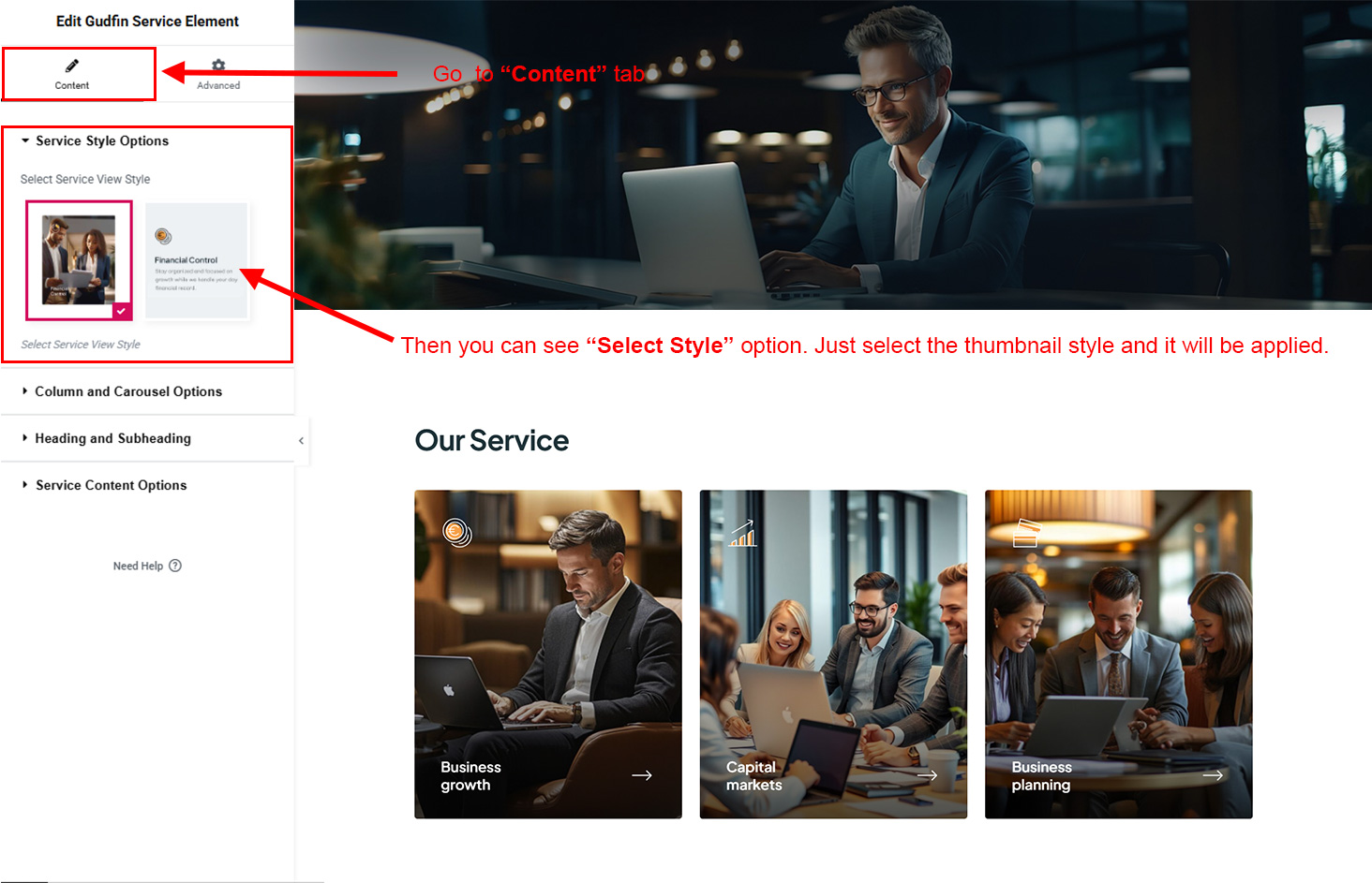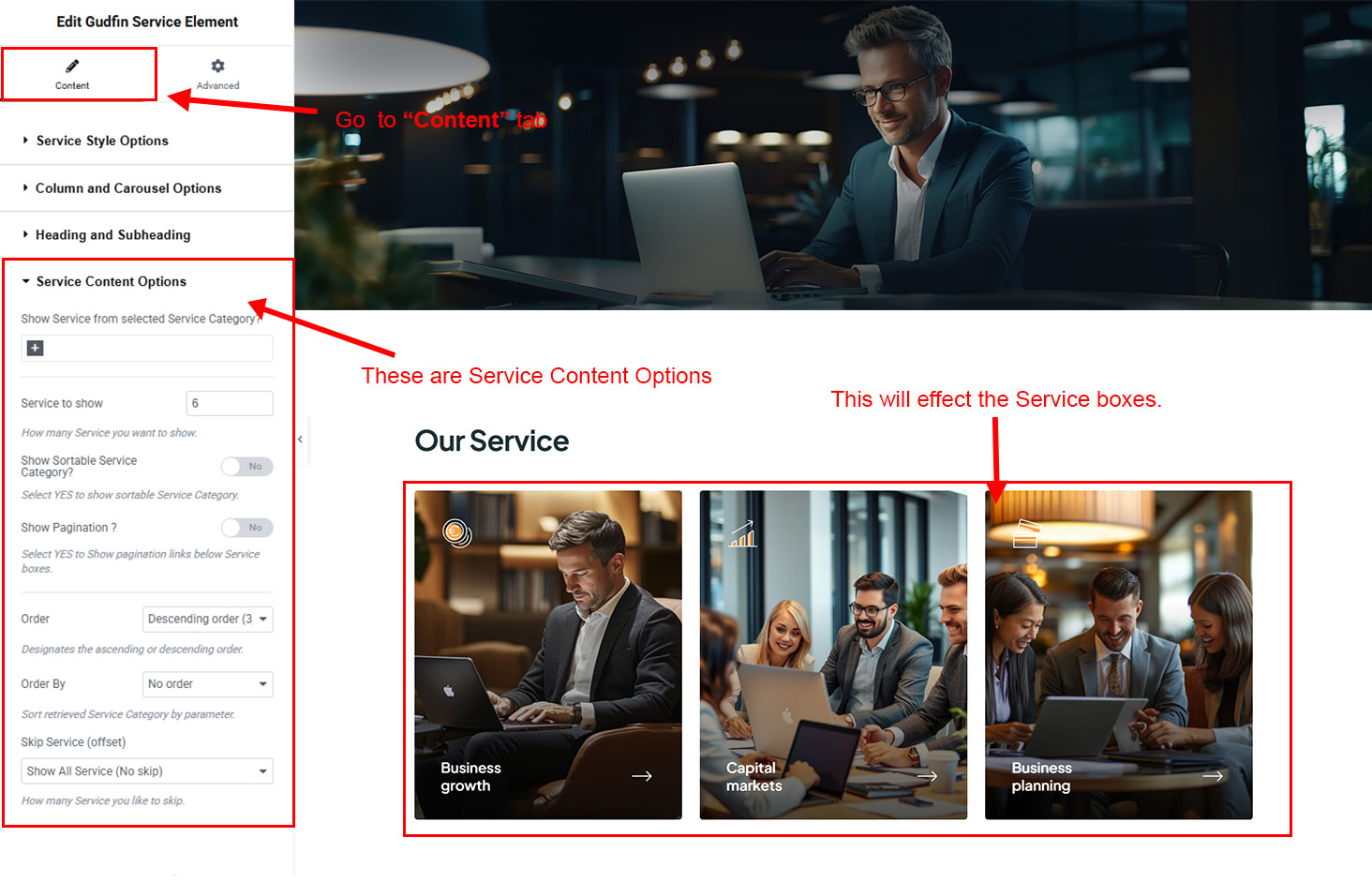 You can select the service options here. Like how many service you like to show, show service from selected category, service order etc.