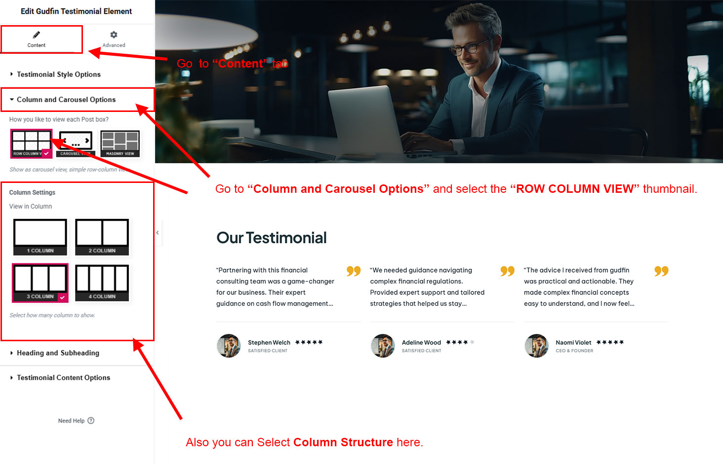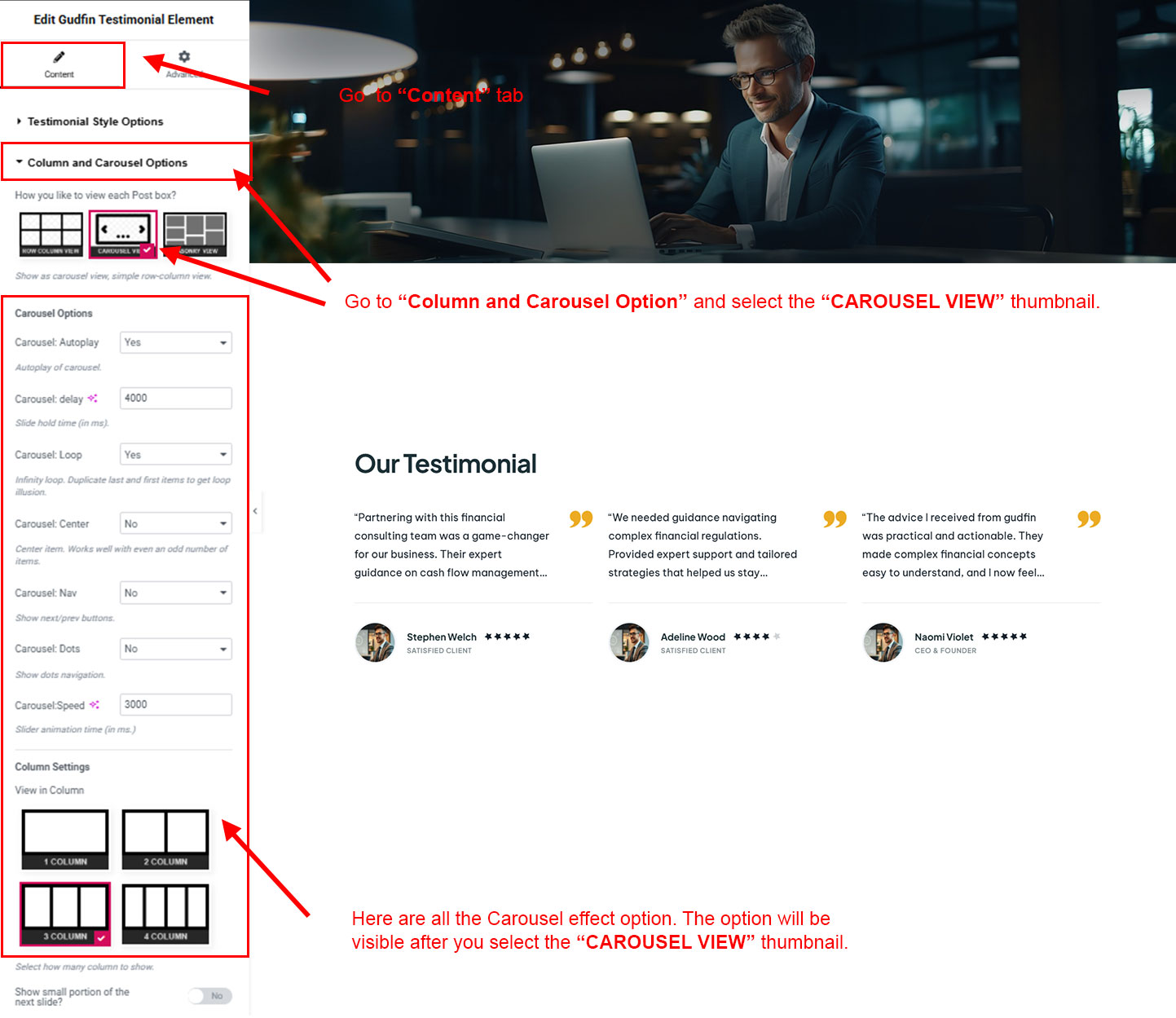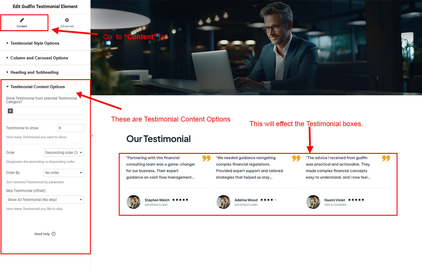 You can select the testimonial options here. Like how many testimonial you like to show, show testimonial from selected group (category), testimonial order etc.