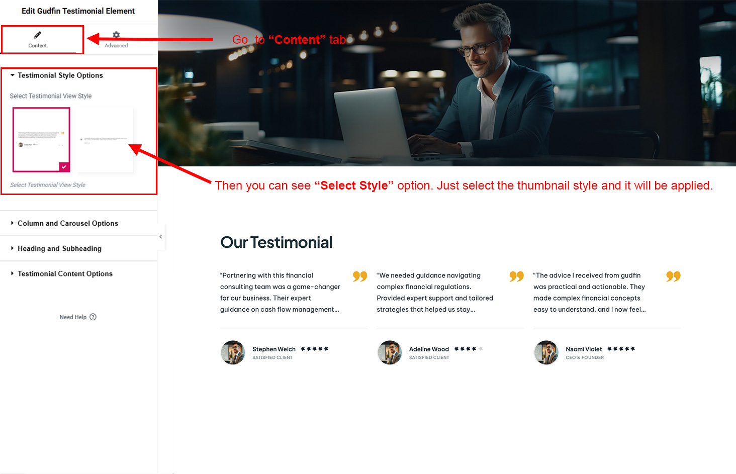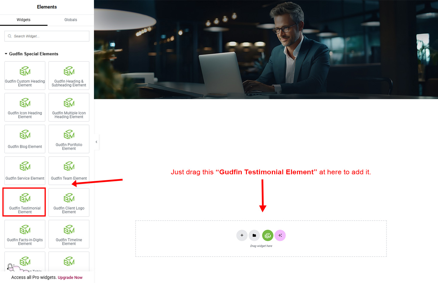 Now we have some Testimonial posts. So we can show all Testimonial on a page. Create a new page and add Gudfin Testimonial Element on a page by dragging it.