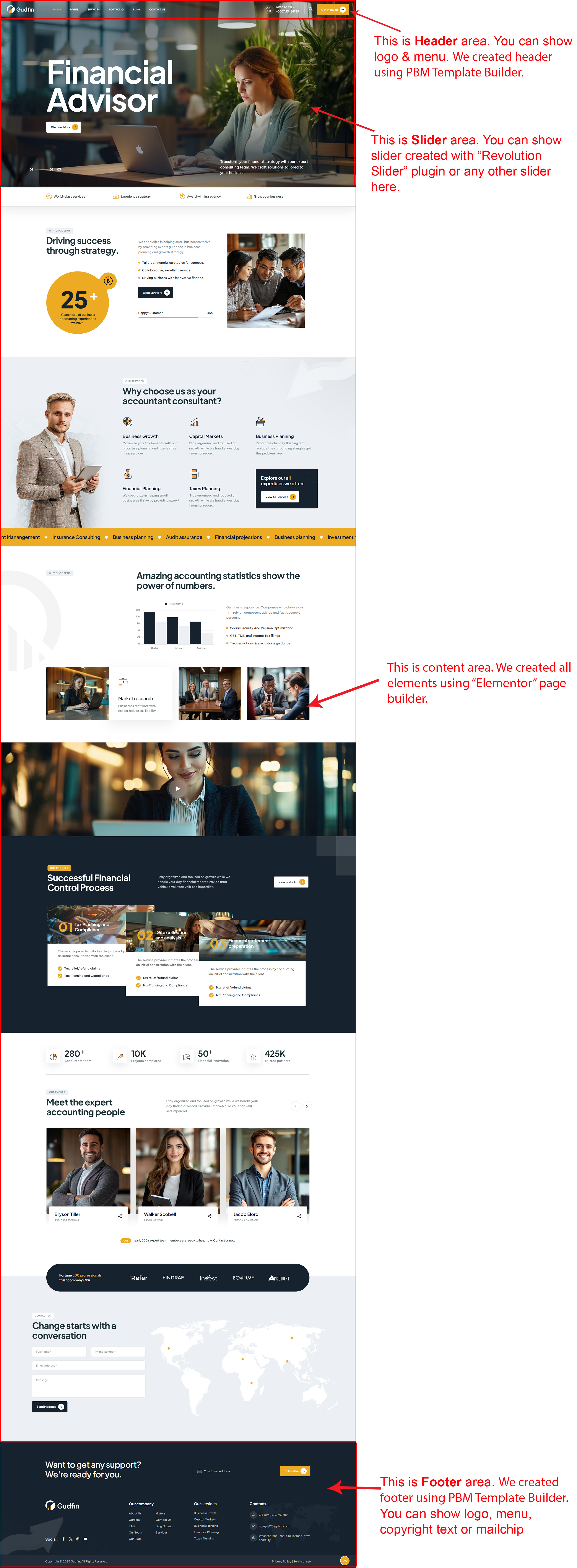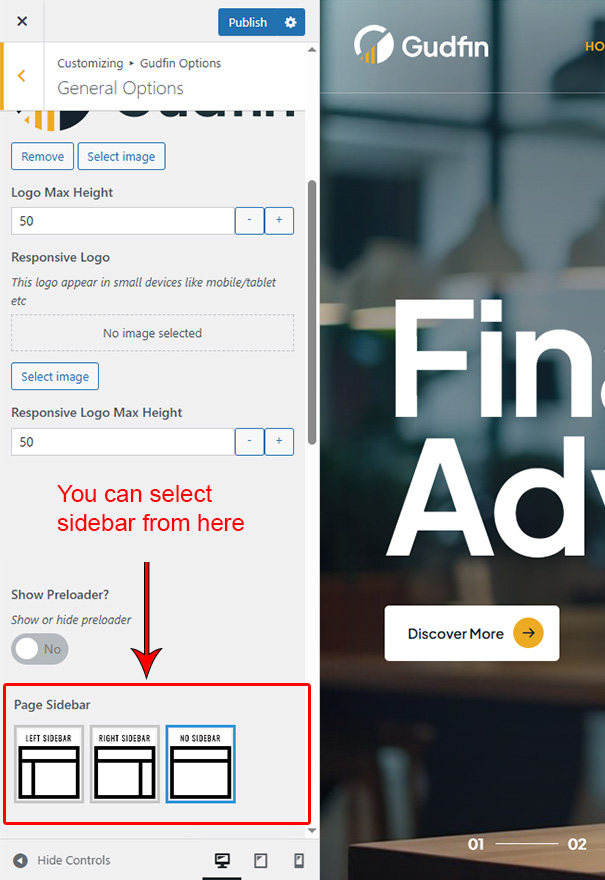There are different sections in Gudfin theme. Here you will find name of each section name so you can find their options easily. You can customize each sections from Gudfin Options easily.