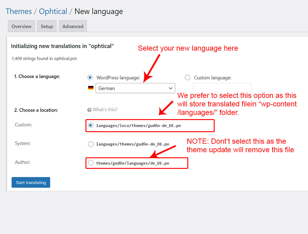 5. Now select the new language. Also make sure you select the last option (the languages/themes/file.po option) so it will store file in "wp-content" folder.