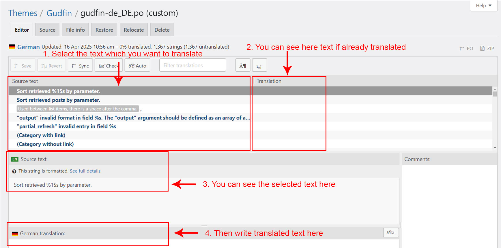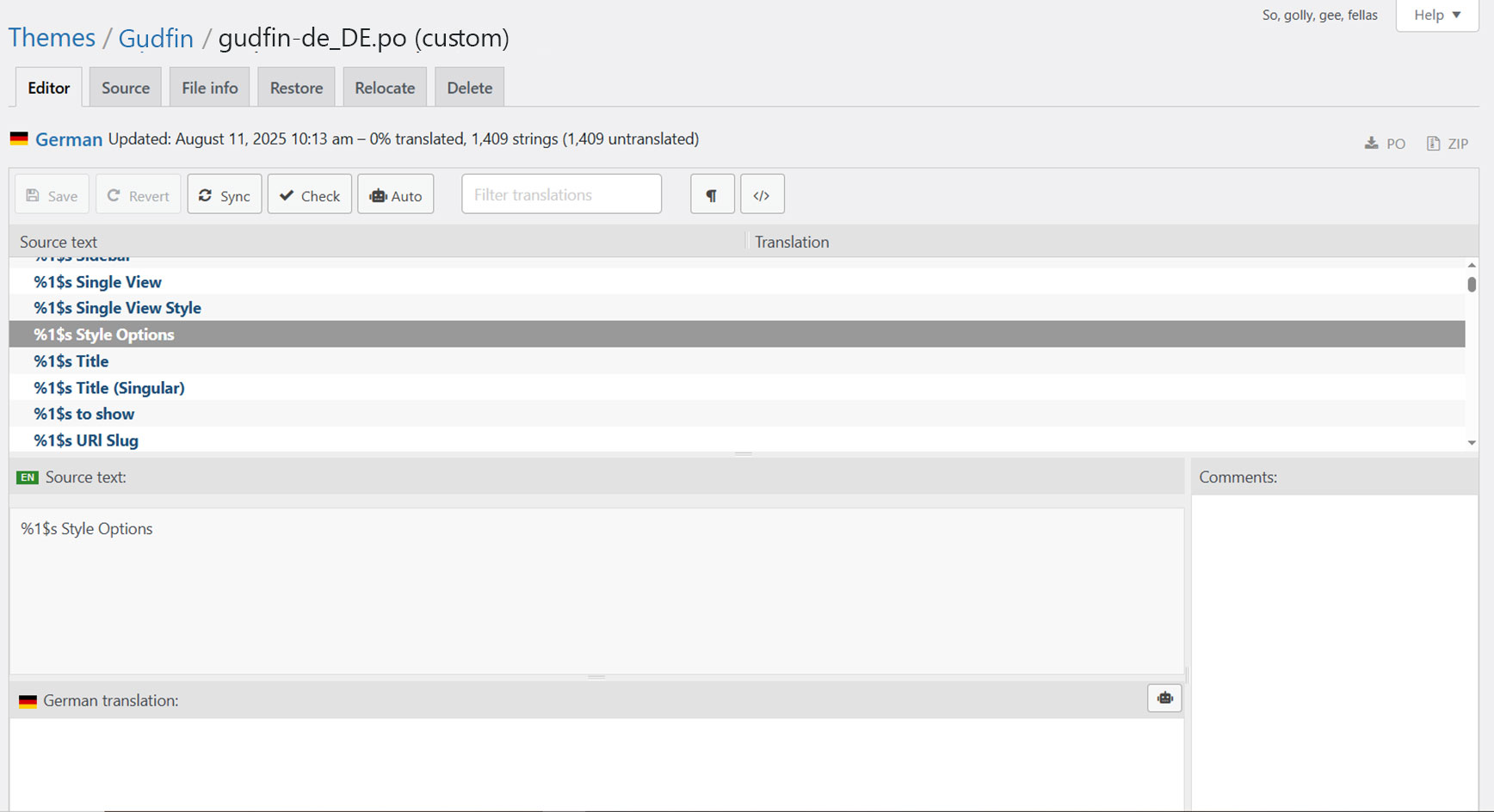 When you are done translating all the needed text strings into your desired language, save the file in /wp-content/languages/themes/ folder with language code in name. For example, if you were translating to the Deutsch language, you would save it as gudfin-de_DE.po. The corresponding gudfin-de_DE.mo file will be auto created by POEdit software.