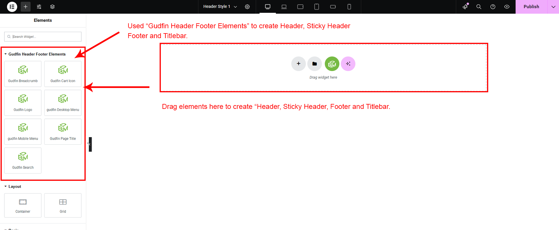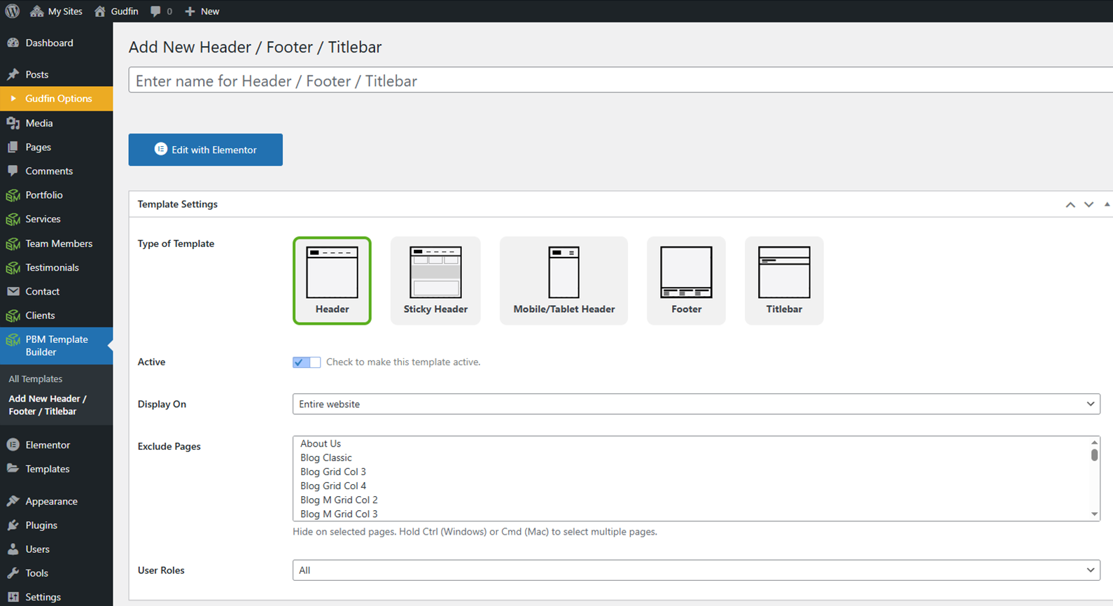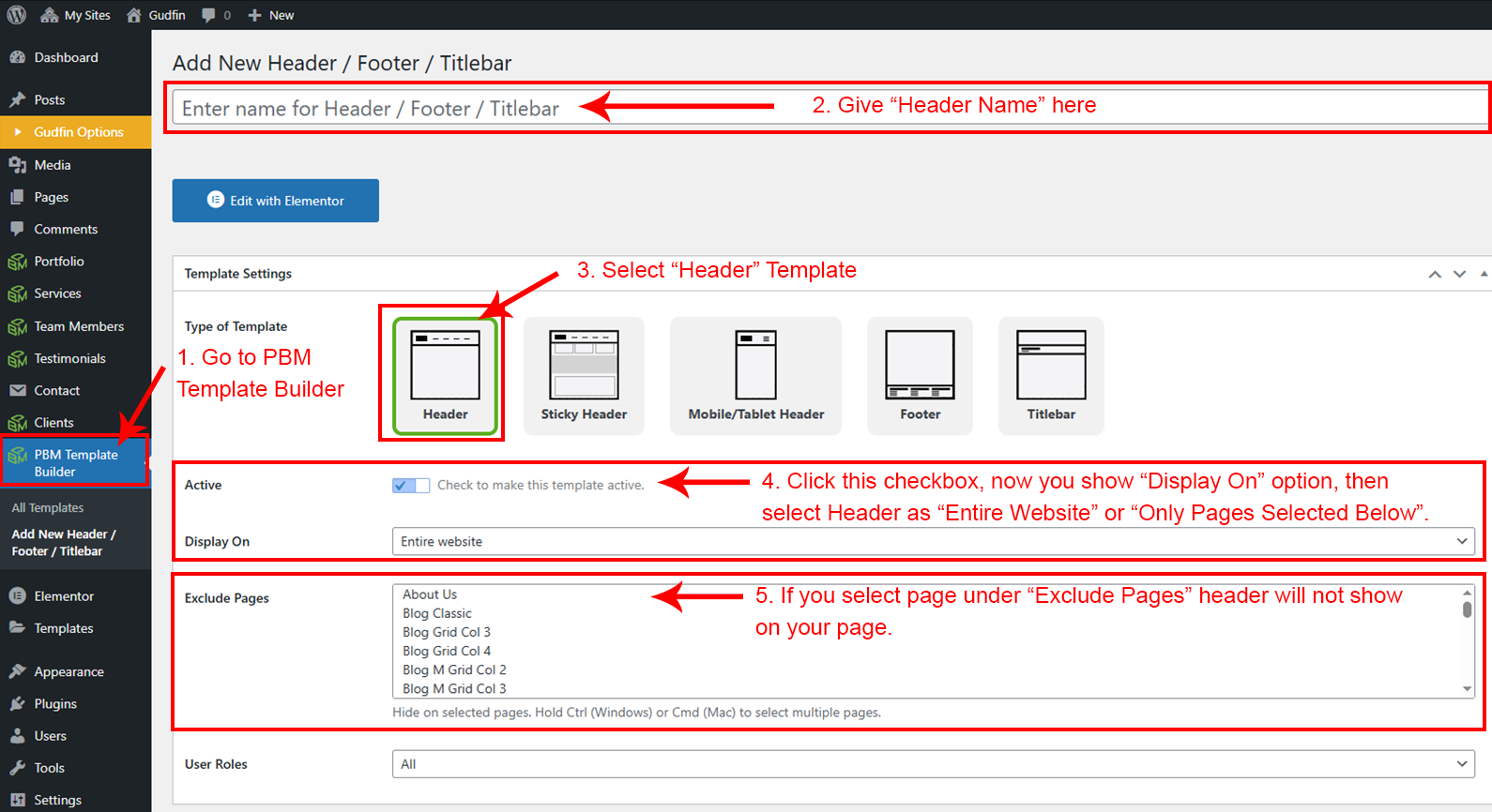 Go to the Dashboard, open PBM Template Builder, click Add New under Header/Footer/Titlebar, name your template (e.g., Header Style 1), select "Header" as the type, and click "Publish" on the right to create your header.