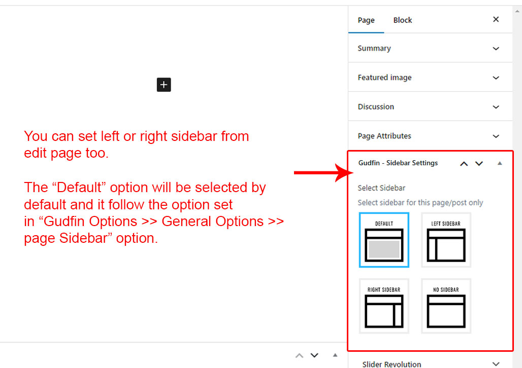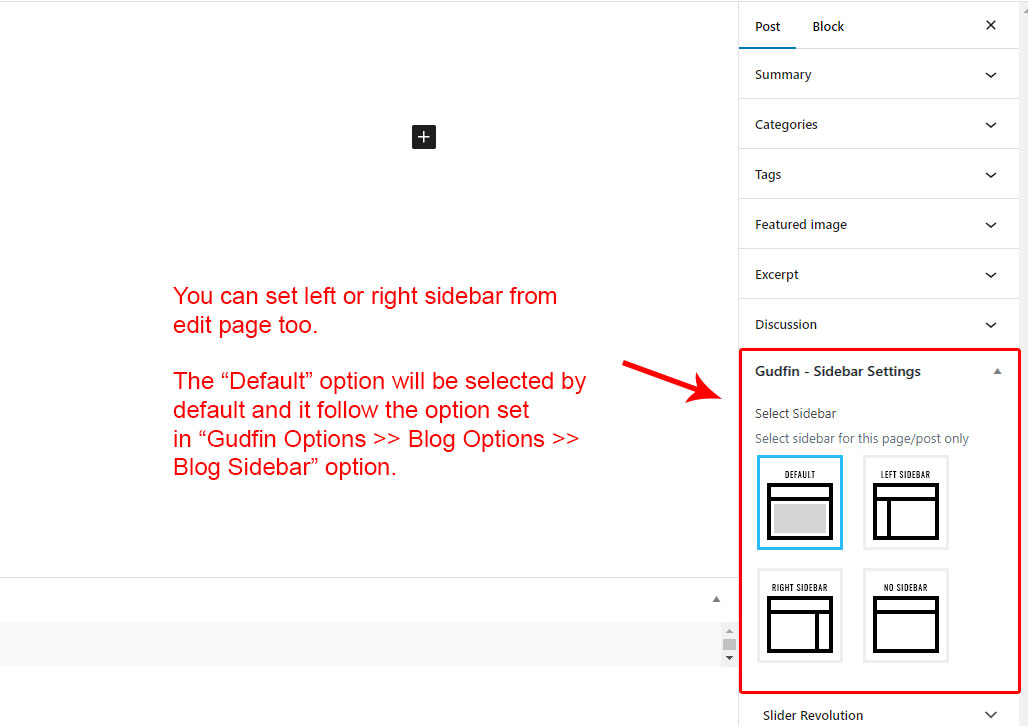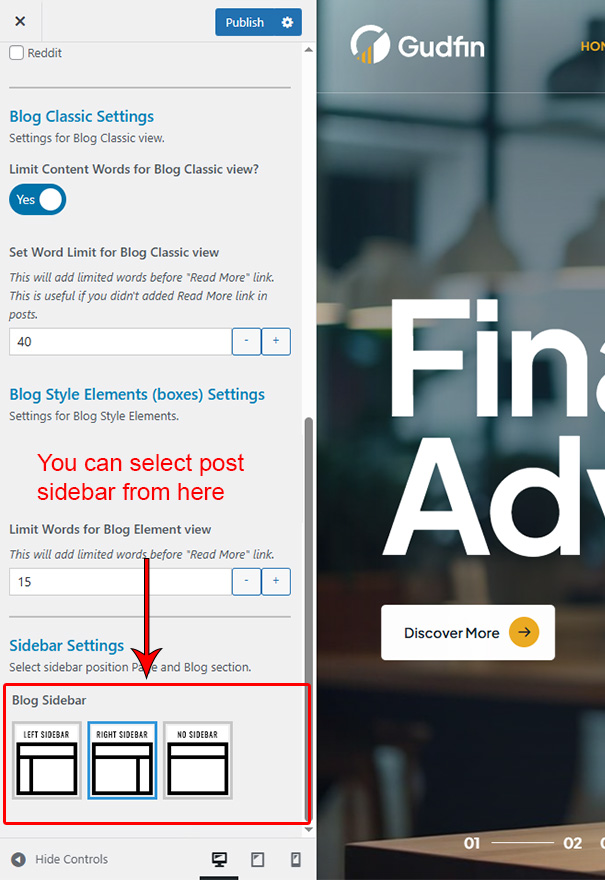 This is specially created sidebar postion (either left or right as selected in Gudfin Options section) that will be shown as sidebar widget on Blog pages like blog list view, single post view, blog category view etc.