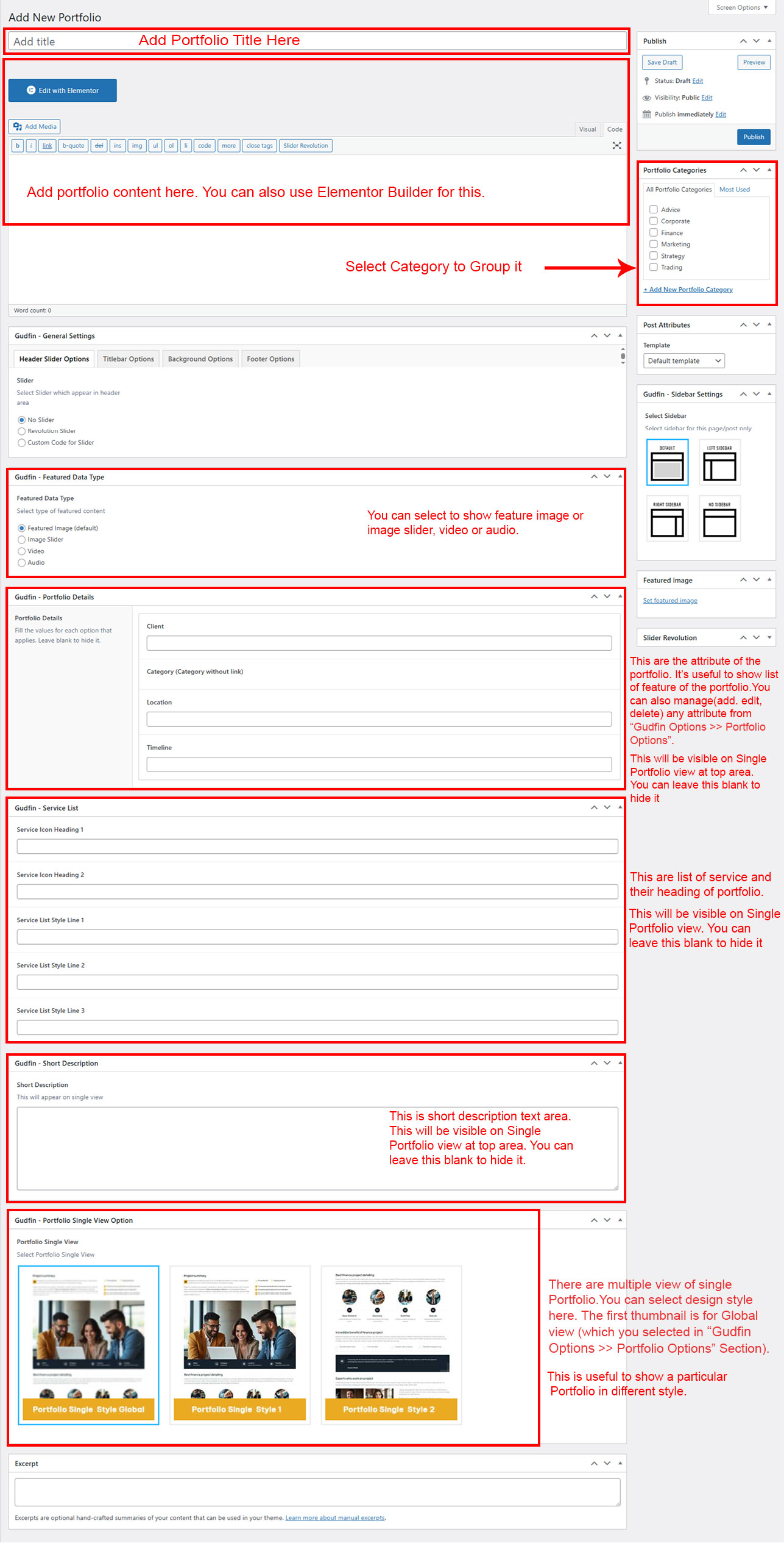 If you already done demo content setup than you can edit existing portfolio and check how we added data so you can understand each option perfectly.