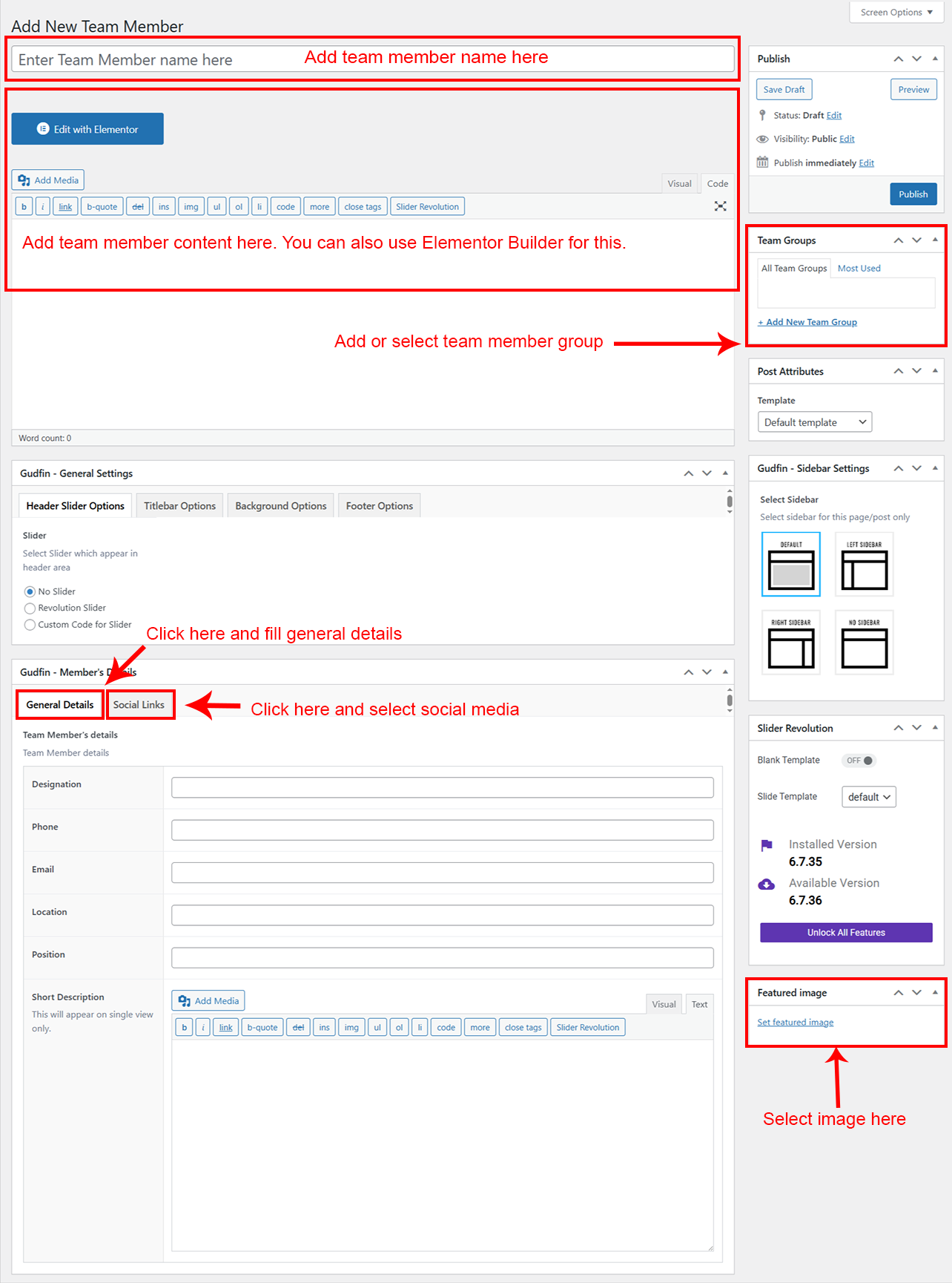 If you already done demo content setup than you can edit existing Team and check how we added data so you can understand each option perfectly.