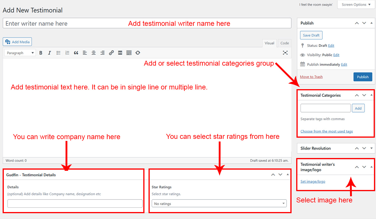 If you already done demo content setup than you can edit existing testimonial and check how we added data so you can understand each option perfectly.