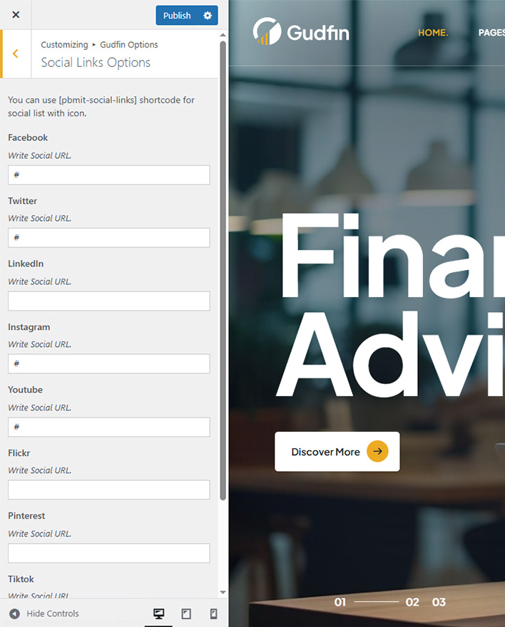 This shortcode specially created to show social links. You can set social links in Gudfin Options >> Social Links Section and write your social links. Than it can be shown using [pbmit-social-links]