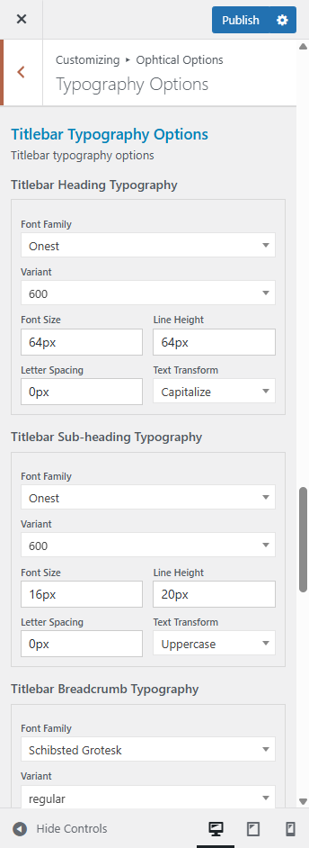 This provides all options like font-family of title, sub-title and breadcrumb