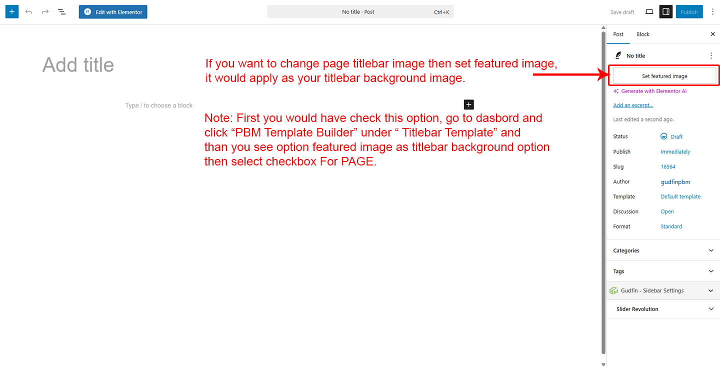 This will override the options set under PBM Template Builder Options > Titlebar page Edit with Elementor > Container > style image. This will help you to set special design the Titlebar on specific page or post.