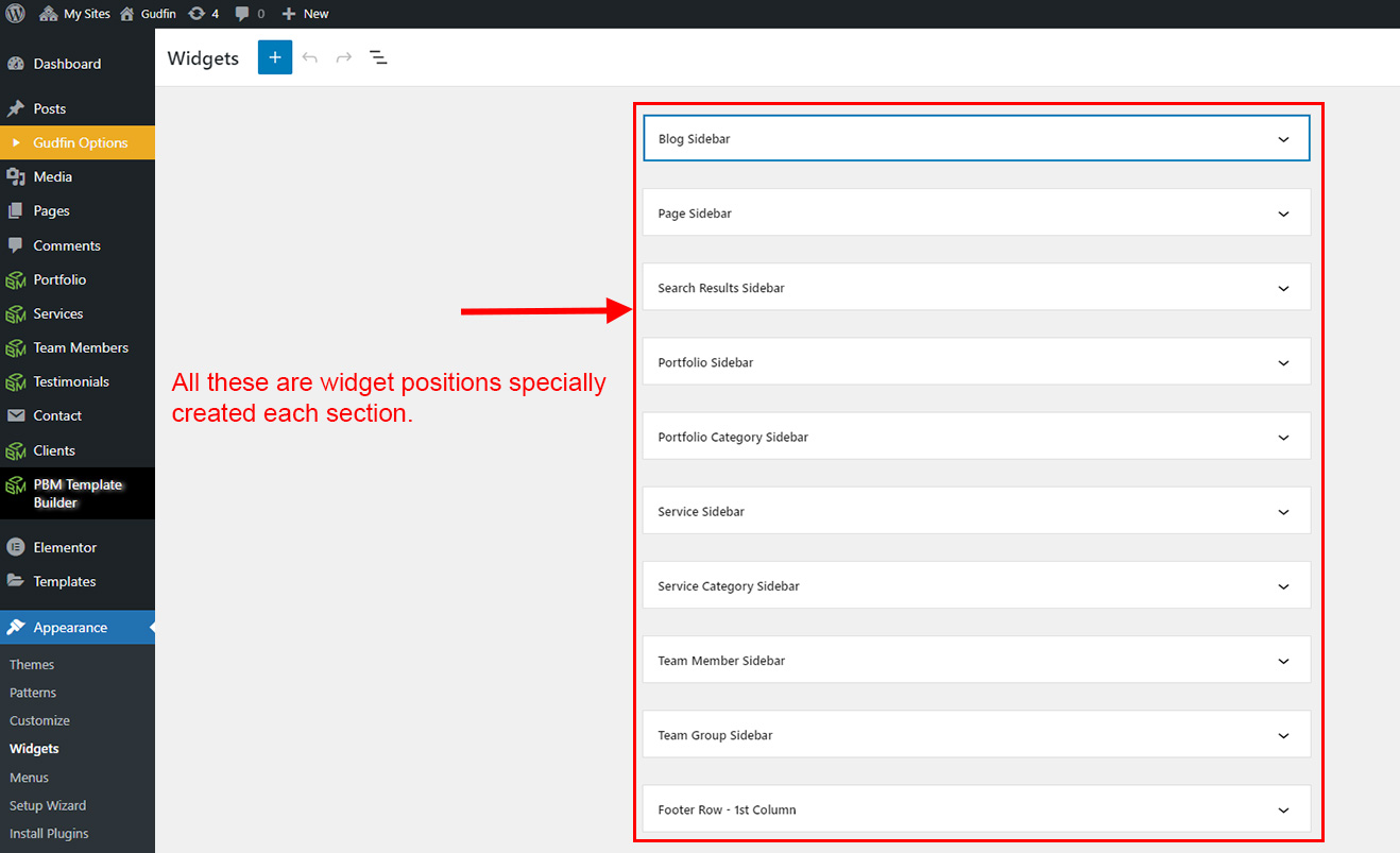 Gudfin theme comes with widgets and different positions. We created special widget positions for each section so you can show sidebar and footer widgets properly according to content. Here are description of all widget positions:
